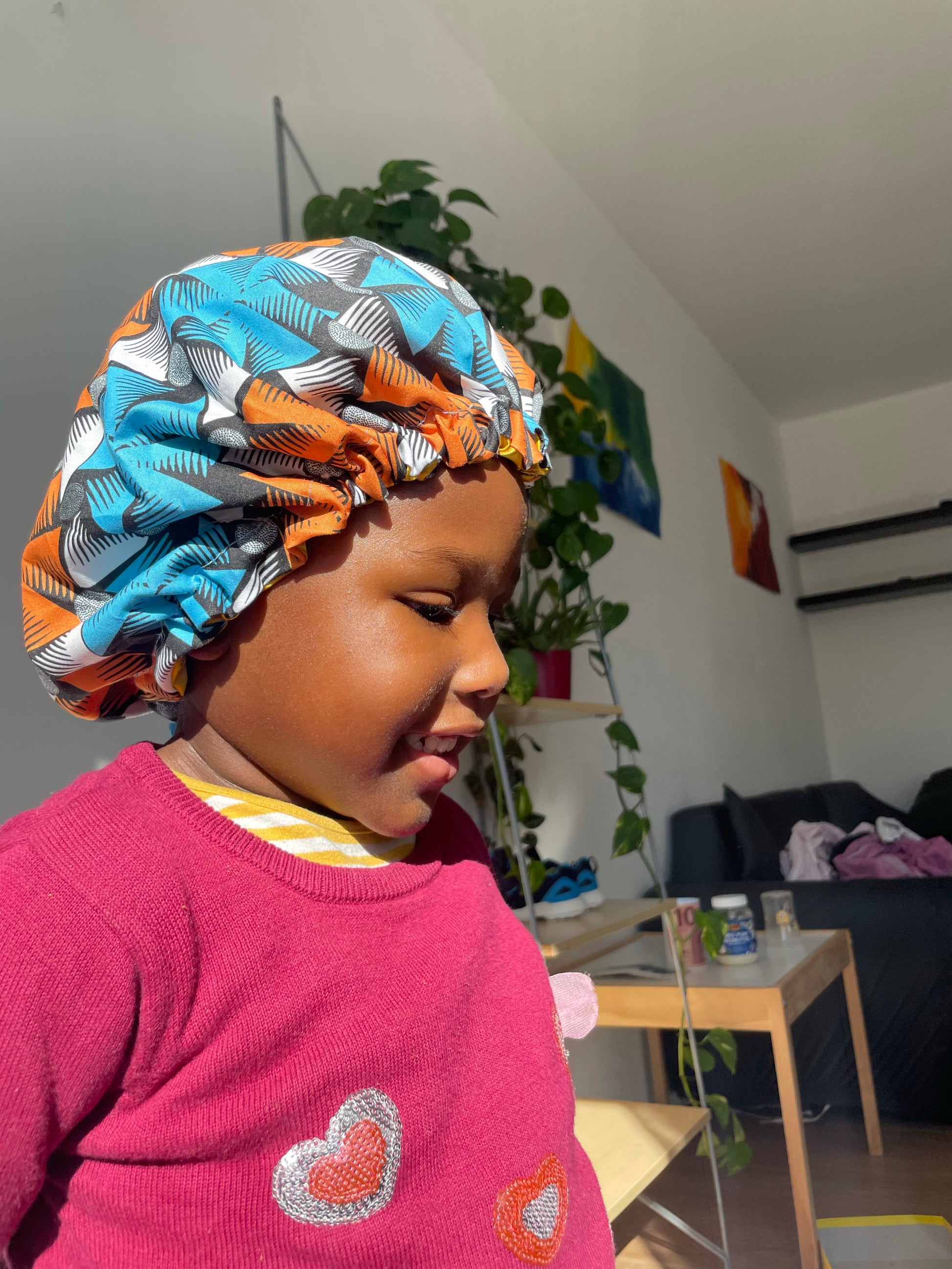 Suitable for ages 2-5. Adjustable to individual head size due to drawstring.