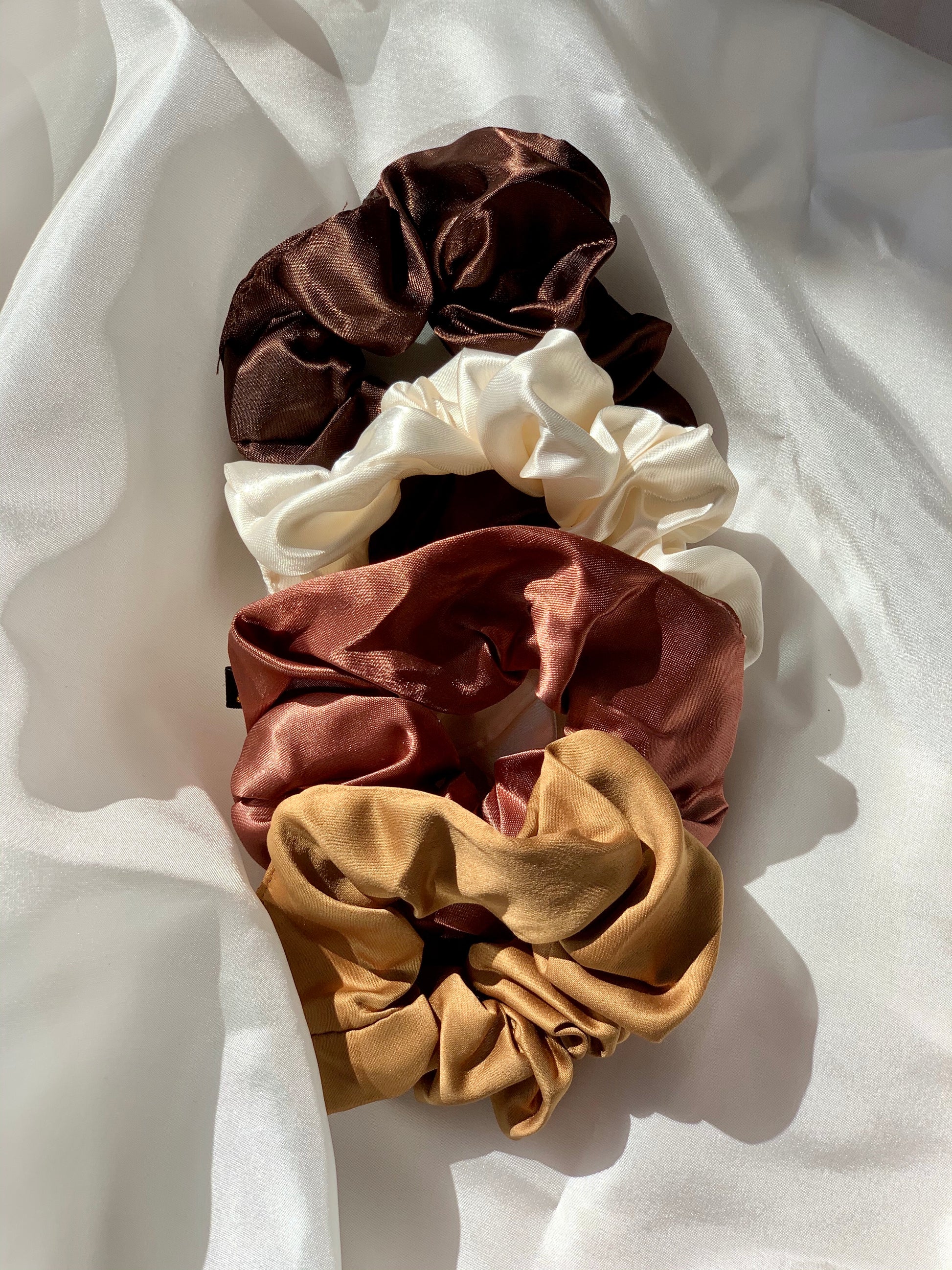 Satin Scrunchies; Dark Brown, Gold, Ivory, Purple Brown